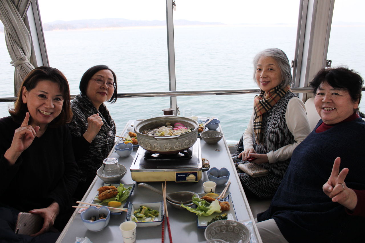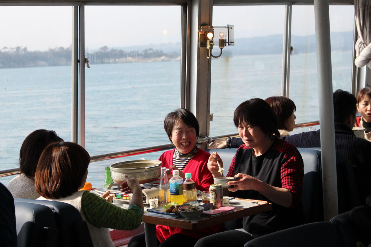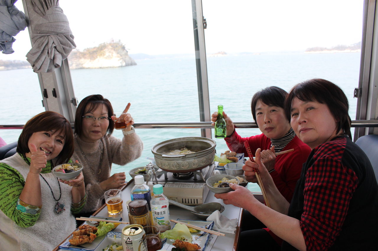 往路は、松島湾を遊覧しながら、新鮮なカキ鍋を堪能。