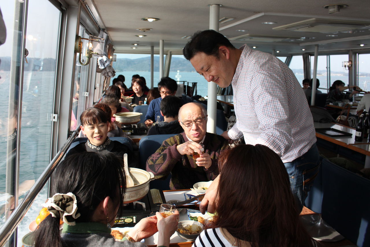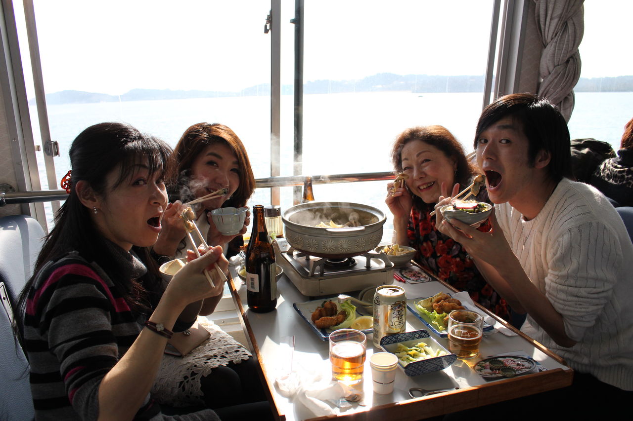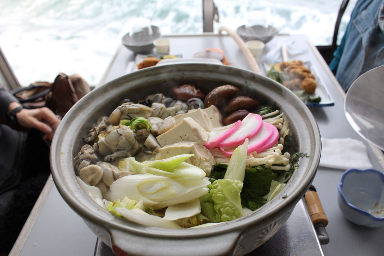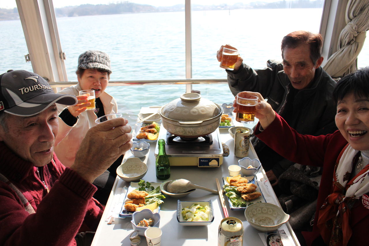 往路は、松島湾を遊覧しながら、新鮮なカキ鍋を堪能。