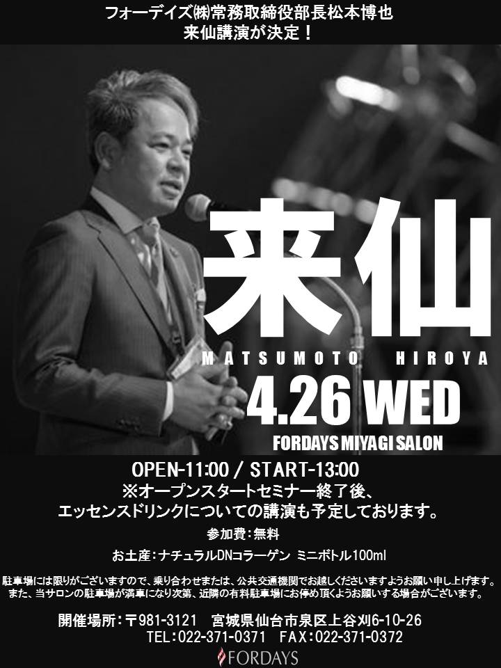 先日は常務の松本がエッセンスドリンクのセミナーをしに宮城サロンに来仙され、さらに勢いづいている今日この頃。