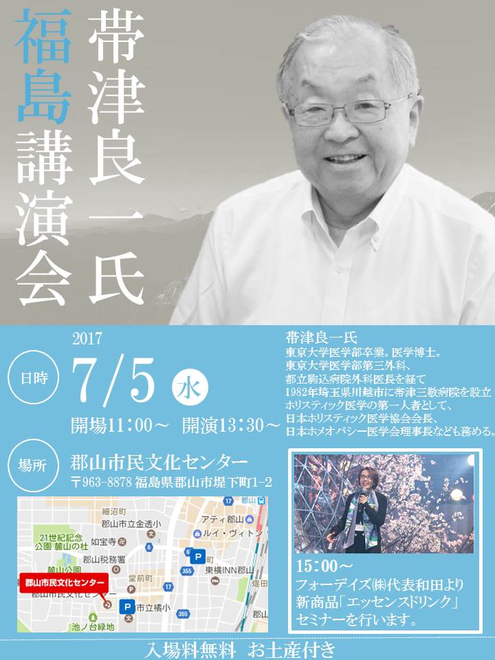 7/5(水)、郡山市民文化センターで帯津良一氏の特別講演会を開催いたします